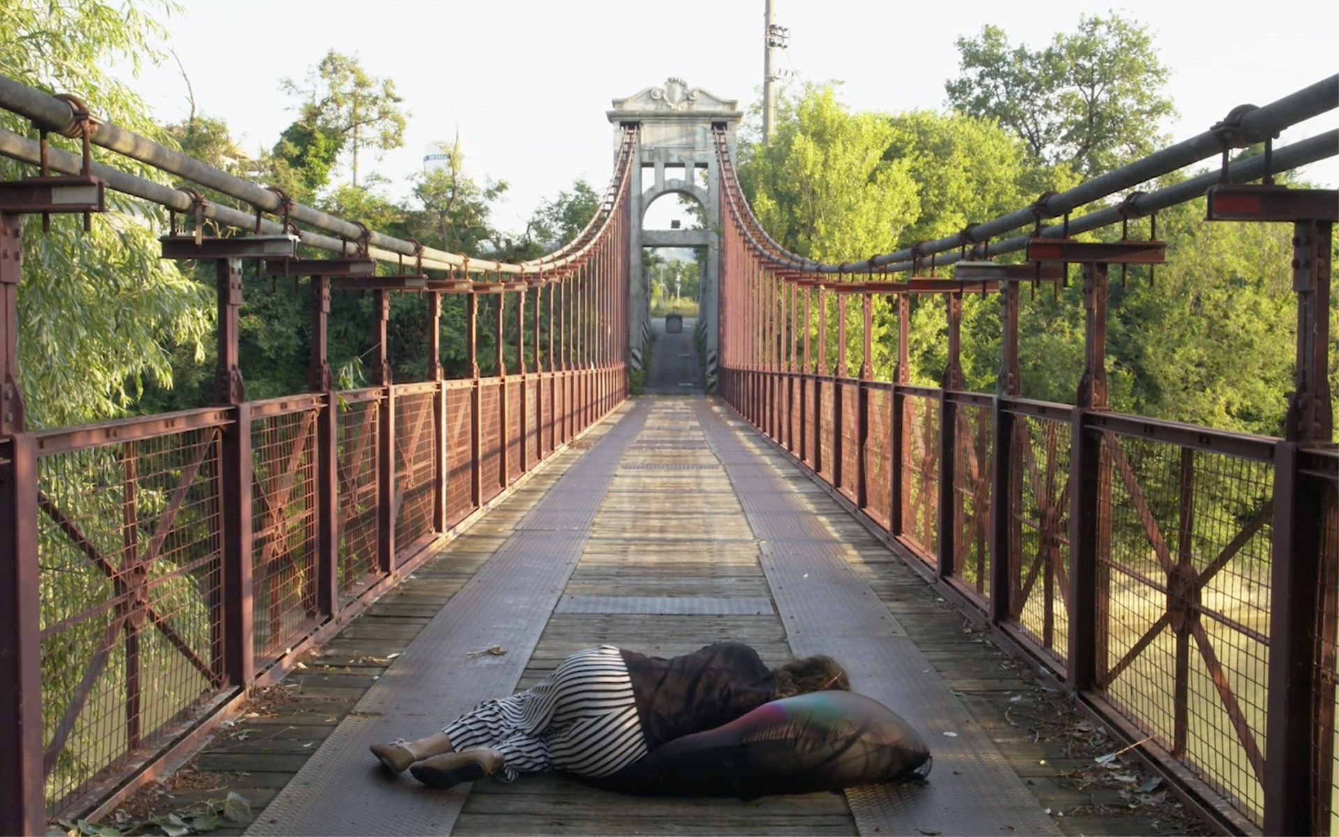 The three videos are recorded in different places (a narrow one-way bridge, a pedestrian crossing regulated by traffic lights, the gate of a private property) and define different situations in which the pillow/backpack plays a key role: it is the performer’s extreme refuge. The artist carries her sight/vision on her shoulders like an object; she reaches a point where she places it on the ground and surrenders to the weight of the world, closing her eyes as an act of protest and defence.