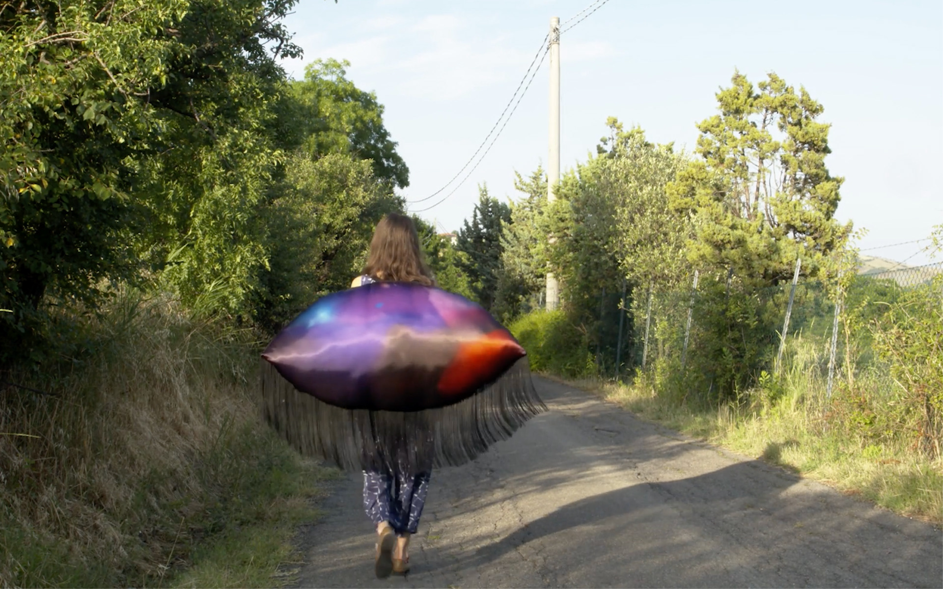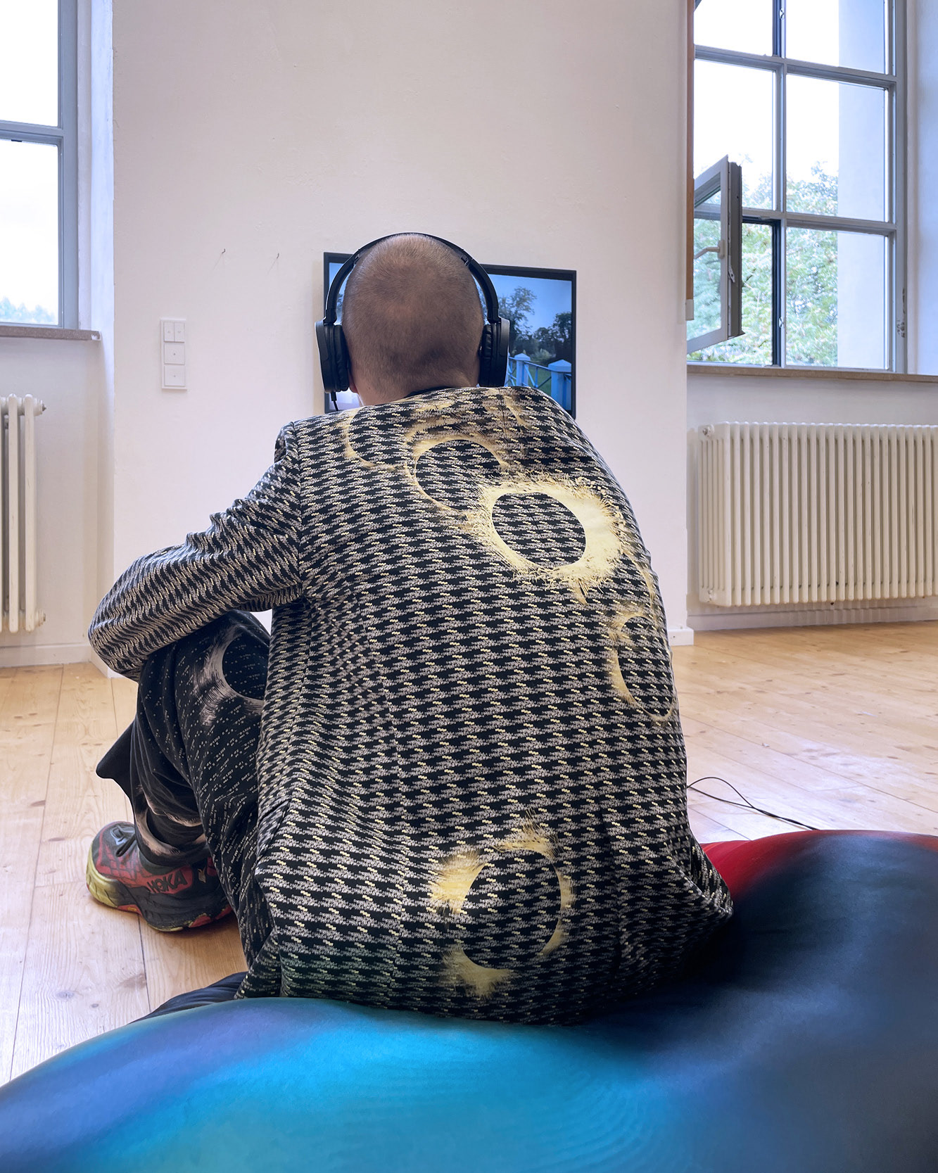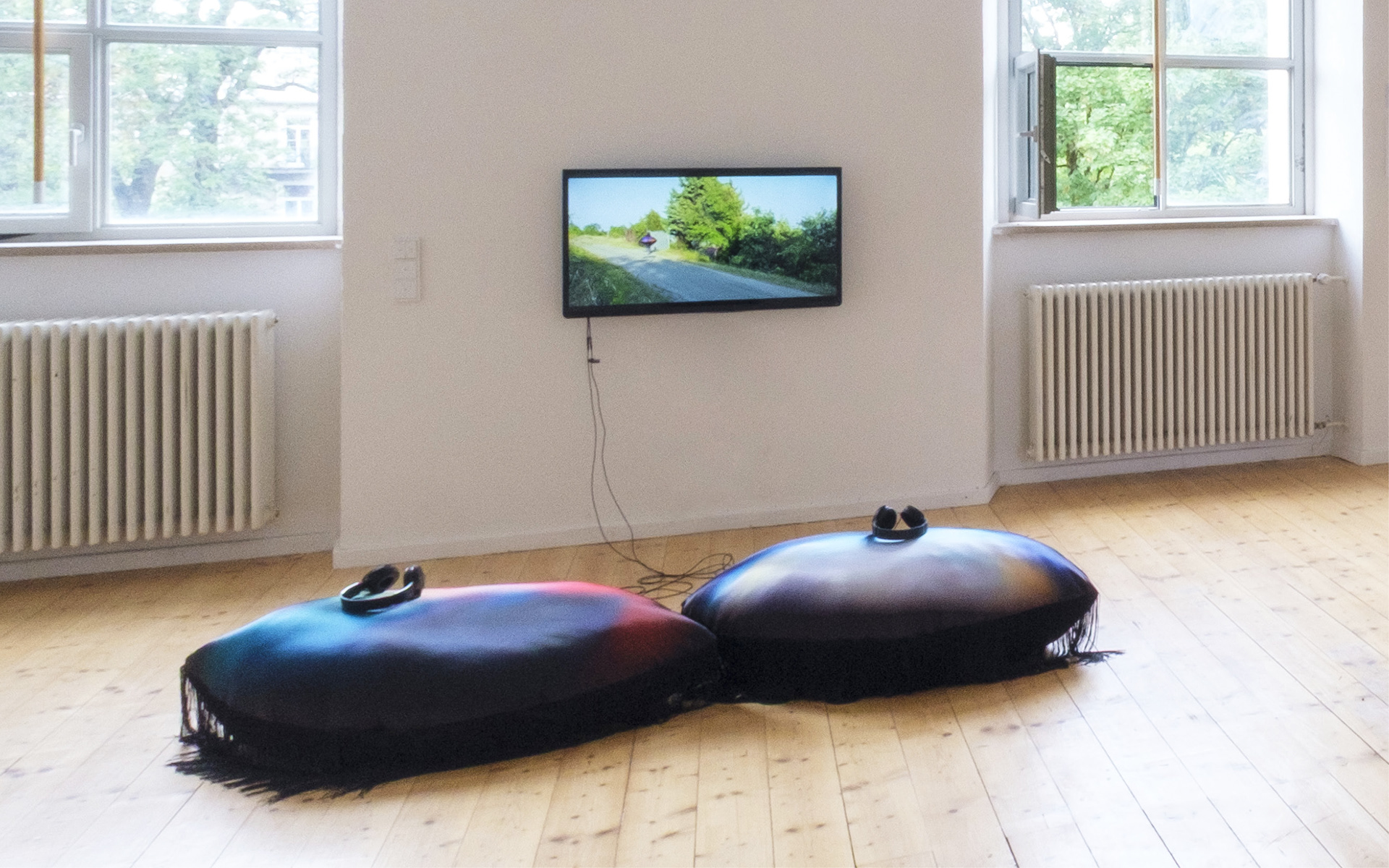 The work is consisting of a performative part presented in a video and a sculptural part. The video shows three episodes. In front of the video presentation two large sculptural cushions welcome visitors to sit down on them to watch the video. The shape of the cushions - that are worn as a backpack in the video - as well as the fringes at the bottom are reminiscent of an eye. The image printed on the fabric is the echo that remains after having looked into bright light and then closing the eyes, leaving open a tiny gap.