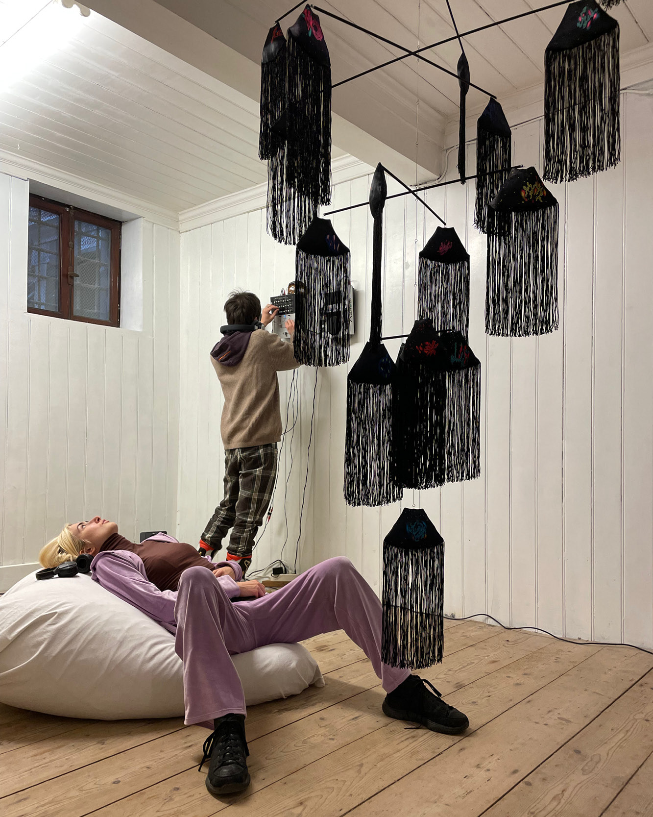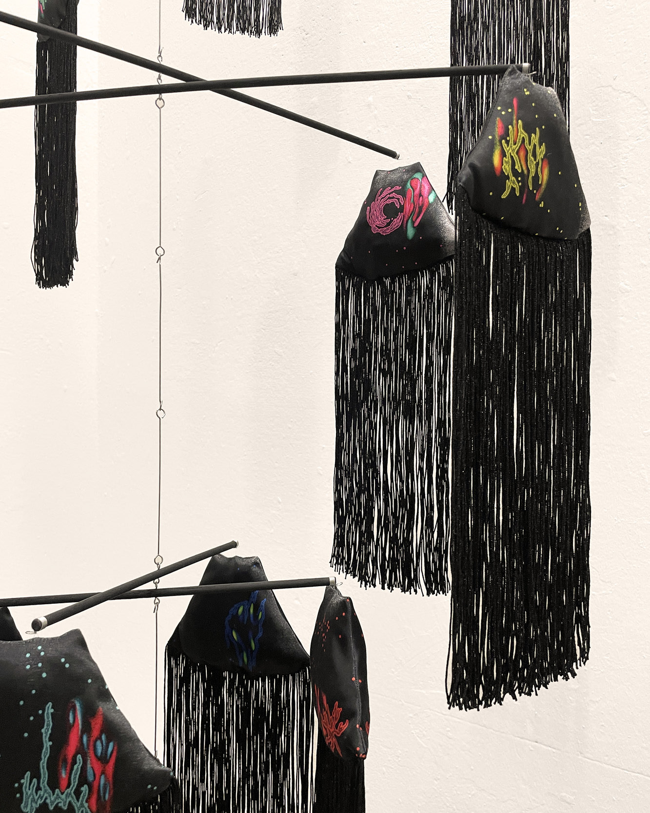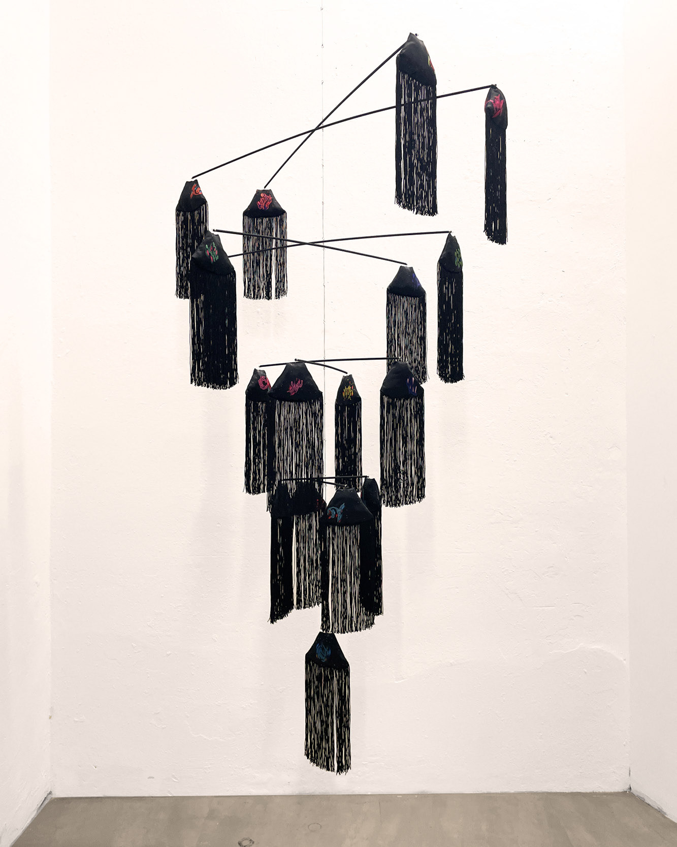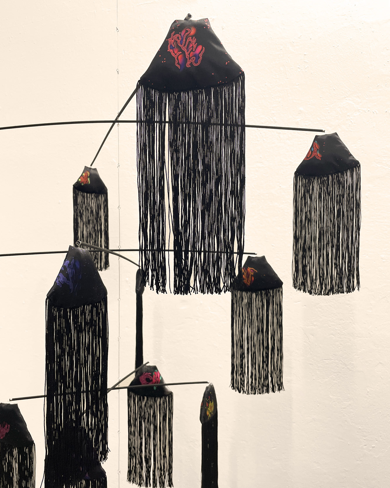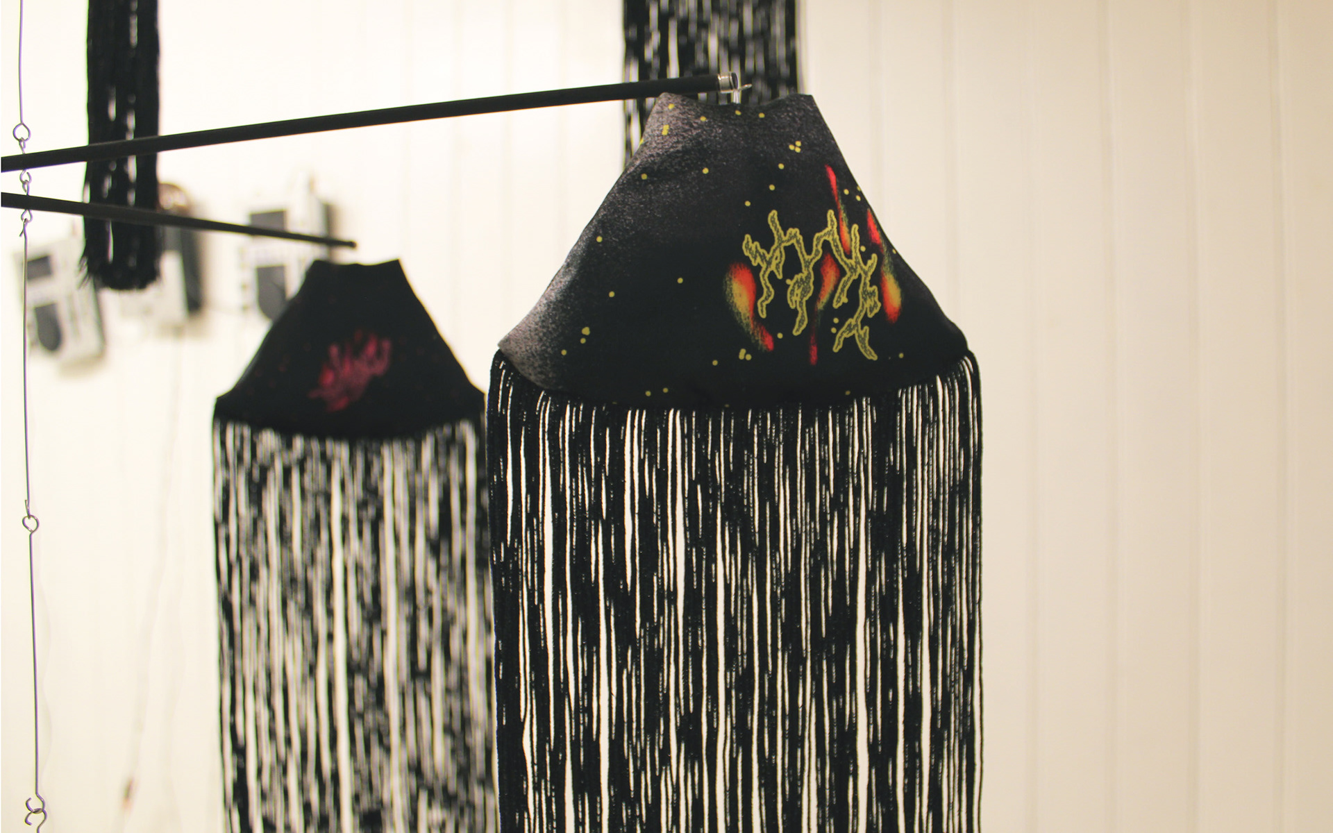 installation; 17 digitally printed satin artefacts, black lamé elastic fringes, 40 x 14 cm each;